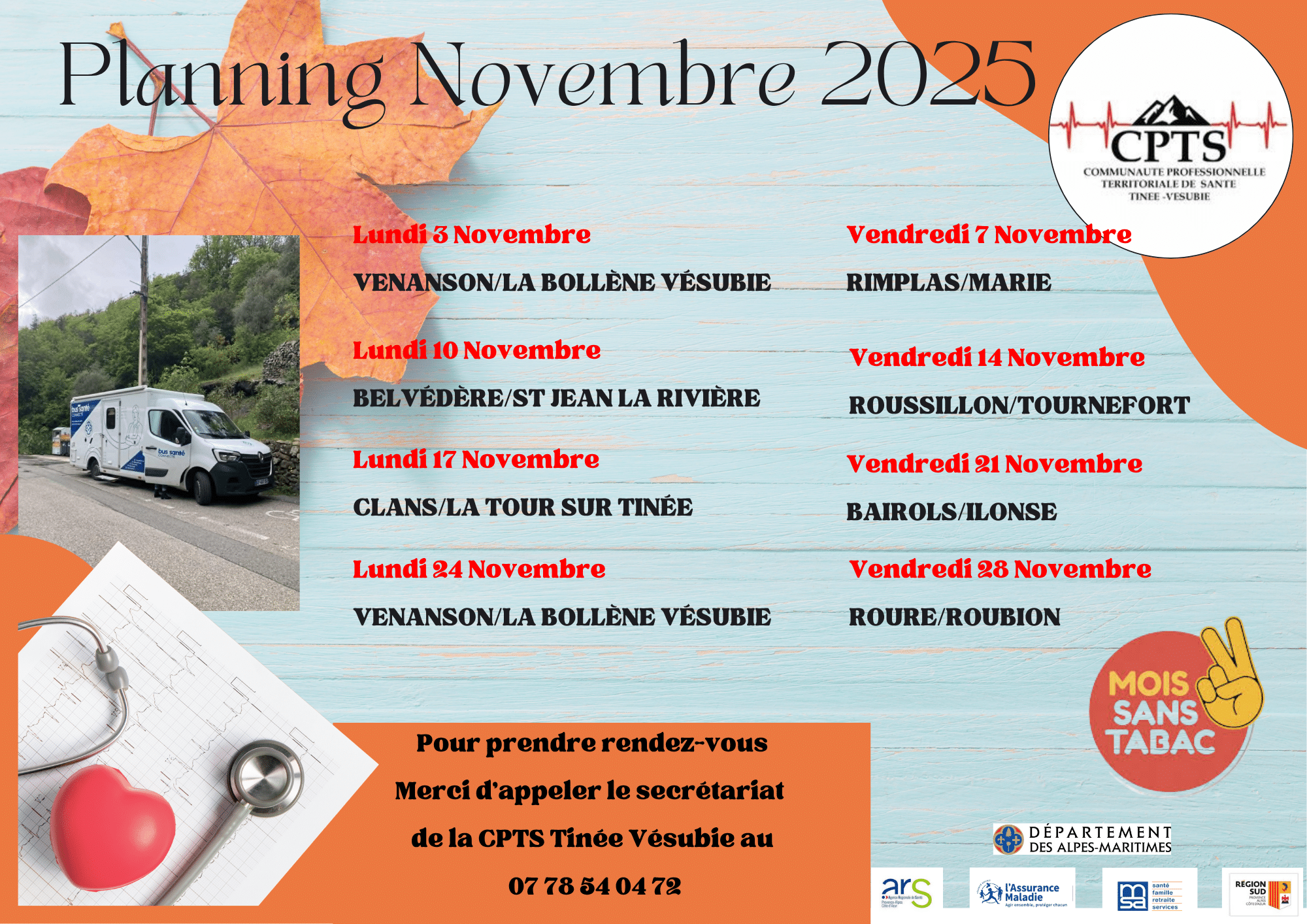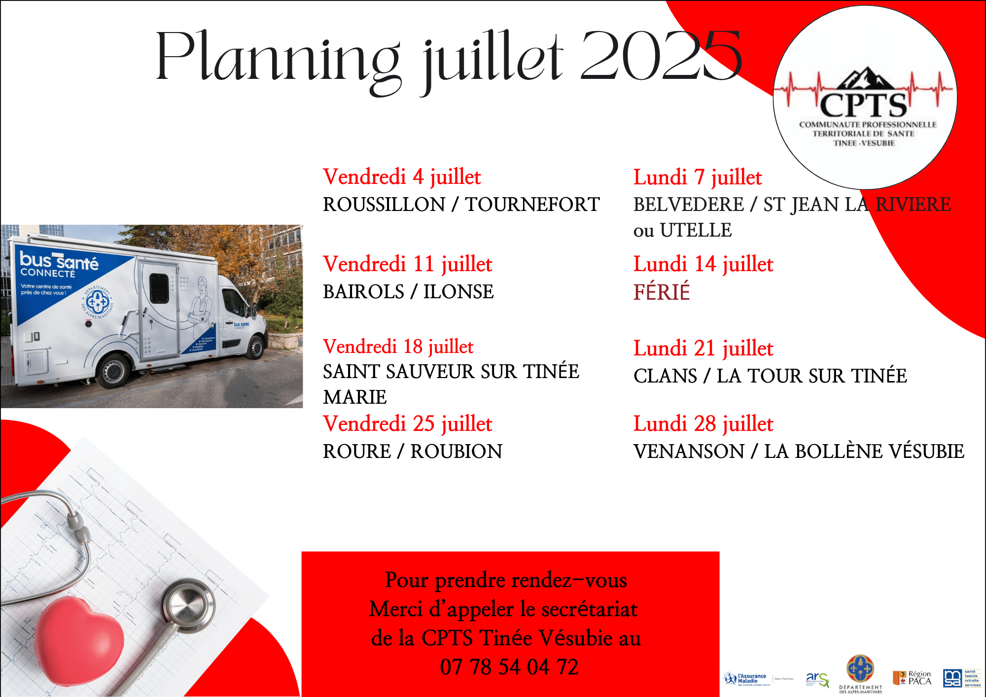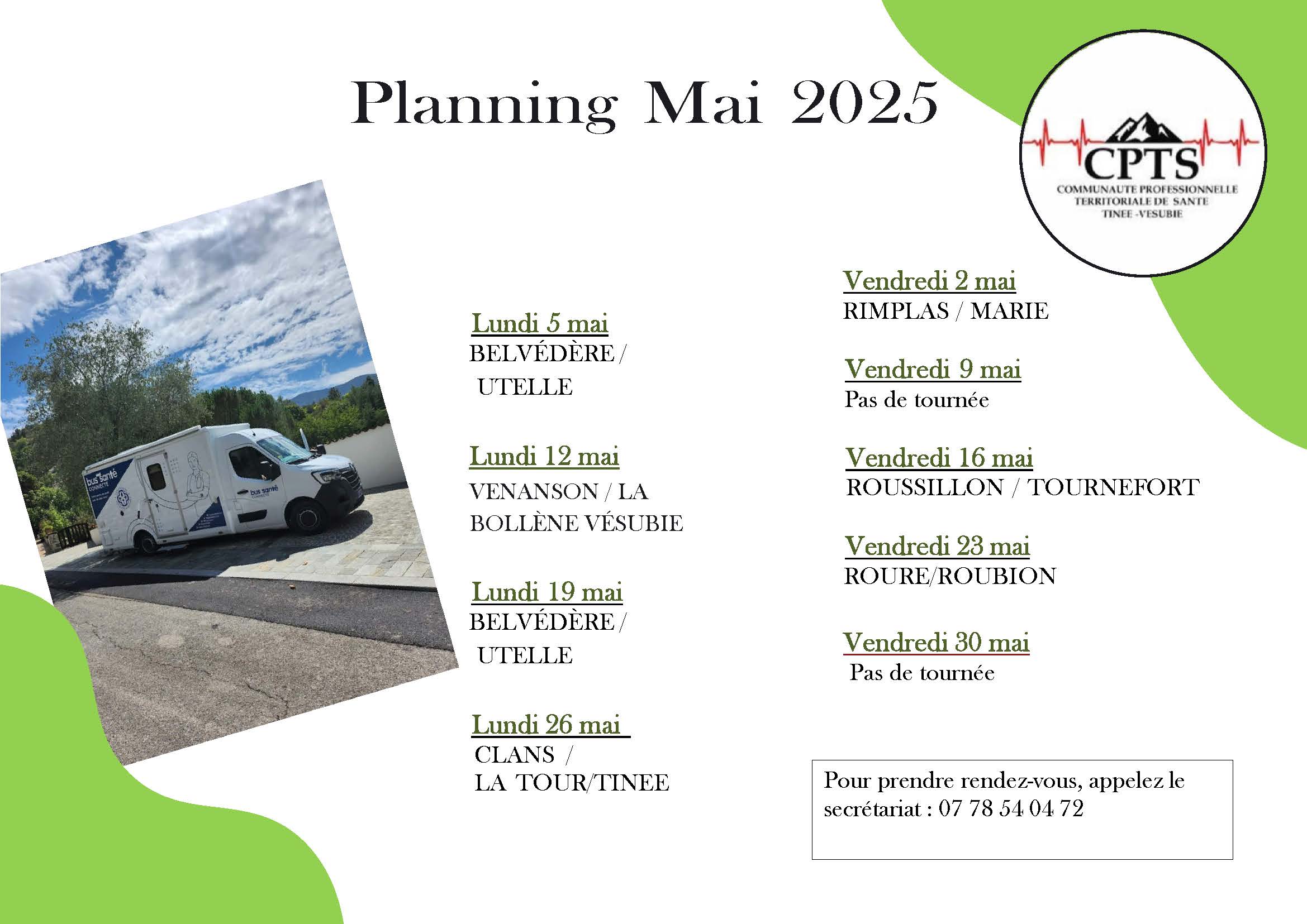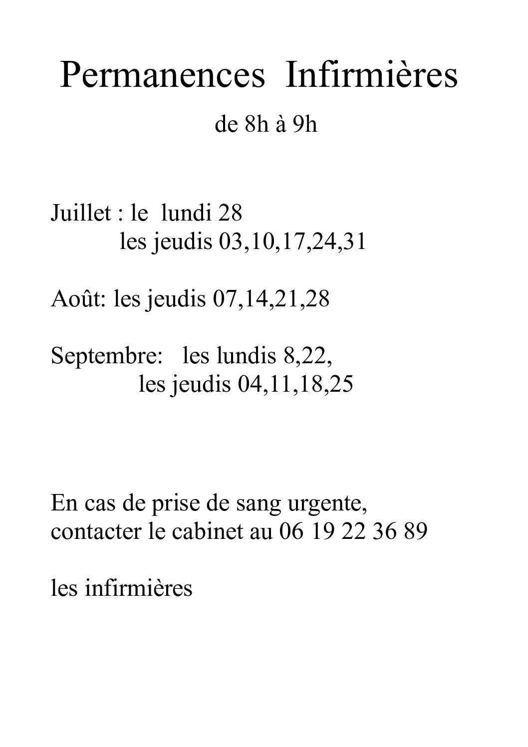 Permanences Infirmières  De 8H à 9H Avril : le lundi 7   les jeudis 3, 17, 24 Mai : les lundis 5,19             les jeudis 15, 22 Juin : les lundis 2, 16 et 30             les jeudis 05,12,19, 26 En cas de prise de sang urgente Contacter le cabinet infirmier au 06.19.22.36.89 Les infirmières